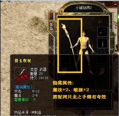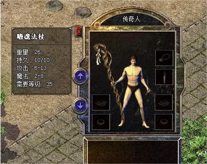 其一在游戏早期是比较常见的一件法师武器,它就是魔杖,属于沃玛套装中的一件,游戏中的等级限制为二十六级,具体的属性加成情况为攻击属性5-10,魔法属性2-5,它的属性加成有些奇怪,有不少玩家都认为使用这件武器,普攻的伤害力是大于技能的魔法伤害的,魔杖在传奇发展中属于中期的过渡武器,因为爆率很高,所以当时很多玩家都钟情于它。