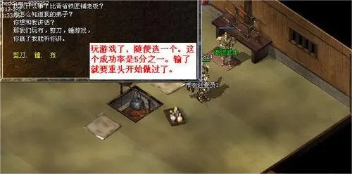 参与这个任务的话,只要等级满三十五级,在准备好三块品质15的金矿,跟比奇铁匠的卫家老头对话,就能激活命运之刃的任务了。任务激活之后就相关的提示,最令人崩溃的就是猜拳的环节,看似简单实则难缠,因为一旦猜错就需要重头来过,所以很多玩家都是猜拳失败再重新积累矿石接任务,如此反复。