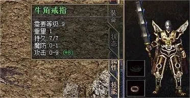 其二是一枚基础的牛角戒指,佩戴等级只有九级,但这枚戒指的属性加成却十分不错,魔防0-1,攻击属性0-9,拥有这样的基础戒指,就算是力量戒指都不换。