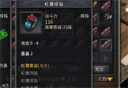 首先简单介绍虹魔的组成,是三件装备组成,对应着三职业的属性,攻击0-4的戒指,魔法0-4的项链,还有道术0-2的手镯。被玩家们嫌弃的主要原因就是每个部件之间缺乏关联,虹魔戒指单看也有缺点,0-4的攻击属性只能算是一般,但持久度却很一般,并且维修的话所需费用不低。虽然战士佩戴之后有吸血的效果,但是微不足道。一开始的时候玩家们还比较感兴趣,能节省一定的药水,但后面发现维修费比节省的药水更多。整体的游戏价值比较高,却德不配位,还不如攻击0-5的龙之戒指。