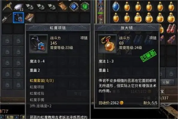 然后就是虹魔项链,属性加成方面跟极品放大镜相比更差一点,上限相同但下限高出一点,这样在整体的输出发挥上能更加稳定,以及生命项链,属性为1-5,更是优质不少。虽有吸血效果能强化法师的缺点,但吸血的效果一般,还不如多花一些心思在魔法盾上。