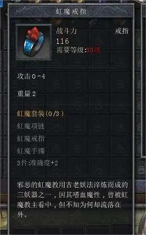 然后是虹魔戒指,这个戒指属性加成一般,但拥有特殊的效果,战士玩家佩戴之后可以具备吸血效果,虽说战士本身血量就比较厚,但佩戴这枚戒指之后能减少喝药的频率,在实战中增加自身的敏捷,唯一的缺点就是后期的维修费有些高。