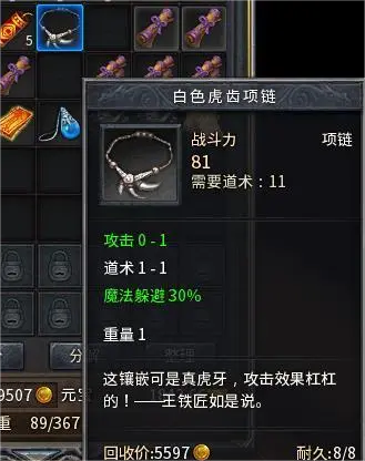 白色虎齿项链在传奇游戏中拥有附加属性很常见,有较高魔法闪避值加成的项链,闪避数值最高有40%和50%,拥有这样的闪避值,对于战士来说在实战中效果很明显,所以一时间这条项链也被炒上了天价,闪避值越高的游戏价值越贵。佩戴上这件装备,法师的技能命中率大大降低,也间接的影响了游戏的公平性。所以后来官方将这类似于BUG的装备进行了修改,削弱之后虎齿项链的魔法闪避大大降低,无法给战士带来超强的变化和优势,自然后续就没什么战士职业佩戴了。各位玩家们,你见过魔法闪避值最高的白色虎齿项链属性如何?赶紧在评论区留言告诉我吧~~