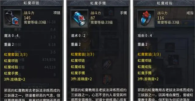 其一,是虹魔套。这个套装一般主要使用在前期的练级阶段,战士职业选择的比较多,主要功能是吸血,具体的属性加成为2点准确值加成,在使用技能的时候能加适量的血,在实战中可以节省些药水上的消耗。