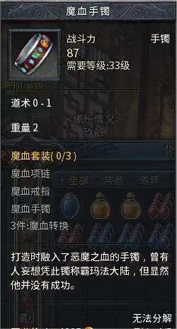 其二,是魔血套。主要受众玩家是法师职业,因为法师本身最大的弱点就是血量低生存能力差,魔血套恰好能解决这个问题,穿戴上自后,主要的效果就是将30%的MP转换陈HP。自身等级越高血量值越好,转换增加的血量值就越多,对于法师职业来说属于精准弥补,所以很多法师玩家为了获取这个套装费劲了心血。