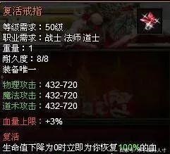 复活戒指:复活戒指属于特戒,这样的装备人人都想要但是却非常稀有。最新传奇私服它的效果从字面意思就不难看出,就是可以使玩家们在死亡之后原地复活。没错,就是这么强大。但是它也有缺点,那就是只能使用5次,虽然次数有限,但是也能在特定的情况之下起到扭转乾坤的效果,但是如果是和别人PK的话,不过在被对手击杀之后直接复活起来接着PK的话,那结果就不一定了。