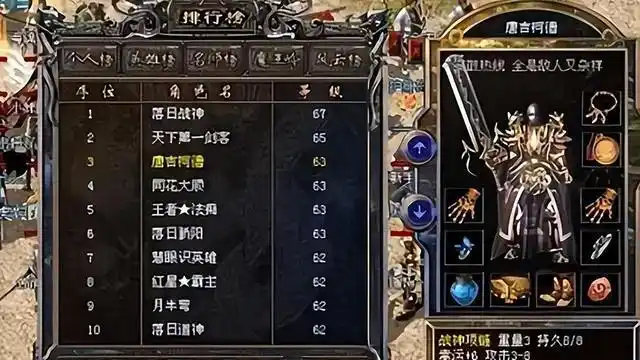 英雄装备也一样闪耀,战神项链有4点幸运值,还有其他很多极品的装备佩戴。唐吉坷德的靴子和腰带攻击属性加成也十分优质,当时游戏中玩家们佩戴的靴子和腰带一般都只有攻击1-0。还有一件装备也是全区的顶级极品,就是一对极品夏普尔手镯,9点攻击属性,还有3点准确值加成。这些顶级装备,都是成就他赫赫威名的助力,也是曾经那段属于他风光时代的见证。