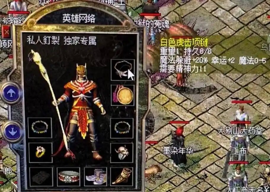 当时的传奇游戏中最顶尖的装备,应该就是屠龙系列的武器,但它的获取难度极大,并且并没开放这几件神器的获取方式,因此多数大佬玩家们所持的武器是龙牙。这位法师大佬的武器同样是一把龙牙,但它的魔法属性加成足足有13点,带来的实战能力非常霸气,当然游戏价值也极高。其他的装备搭配也非常强,项链是一条具备9点魔法属性加成的极品,并且还带有隐藏属性加成,头盔选择搭配的是一顶极品道士头盔,各方面属性加成非常全面,防御属性加成为1-2,魔防属性加成为2-3,魔法属性加成为5点,这些装备组成中的任意一件,都是其他玩家们追逐的终极目标。